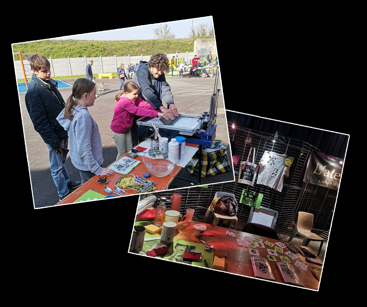 Communication pour le festival Pabfest. Atelier de sérigraphie pour de l'impression de textile et de sous-bocks.