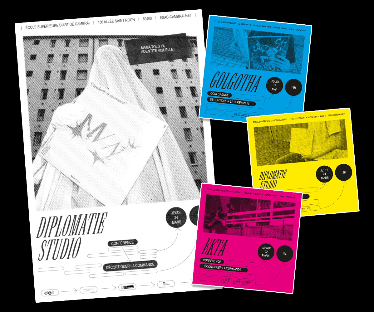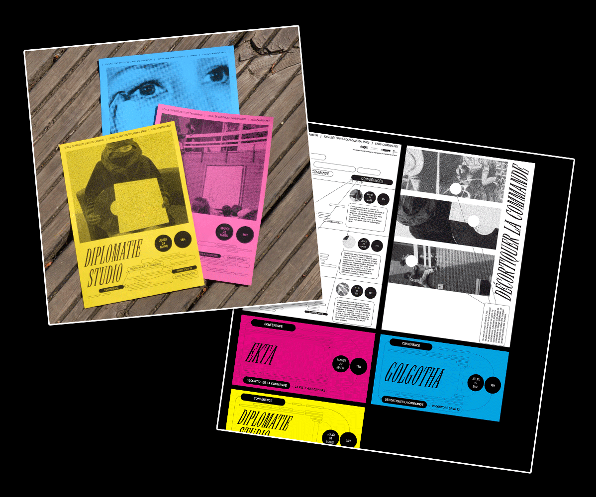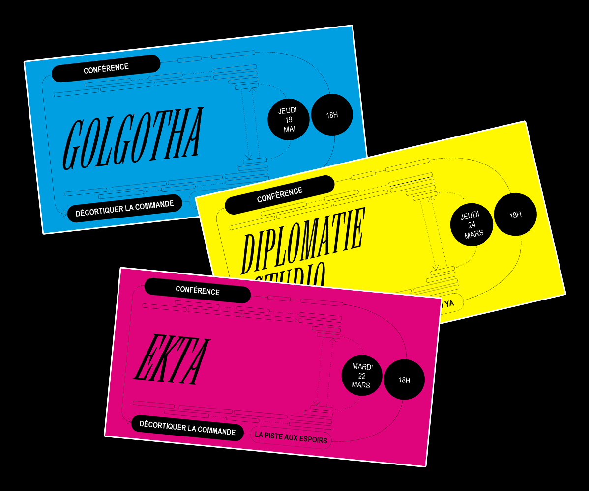Identité visuelle pour le cycle de conférences «Décortiquer la commande». Mise en place par l’ÉSAC invitant 3 studios à venir présenter leur processus de travail par le prisme d’un de leur travaux de commande. Pour cette saison, les invités étaient Ekta (BE) , Diplomatie Studio (FR) et Golgotha (FR).