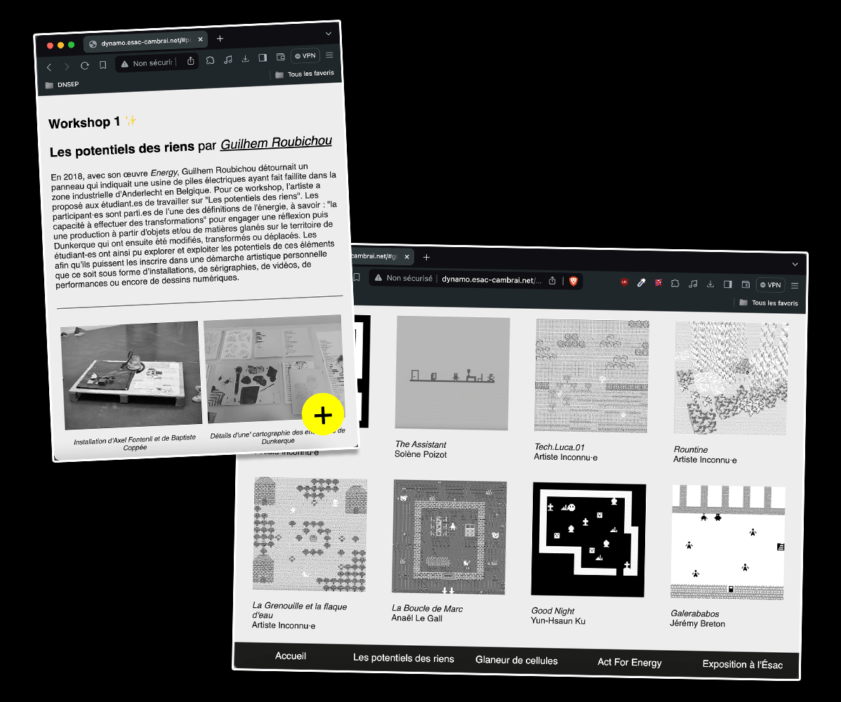 Dynamo est une restitutions des productions réalisées dans le cadre du worskhop “Énergie”. Cette restitution a pris la forme d’une exposition à l’Ésac du 7 décembre 2022 au 21 janvier 2023. Il s’agissait d’une restitution à chaud, l’occasion de faire profiter à toute l’école des projets des étudiant·e·s de 4e & 5e années. Cette exposition est augmentée d’un site-web qui permet l’archivage des productions.