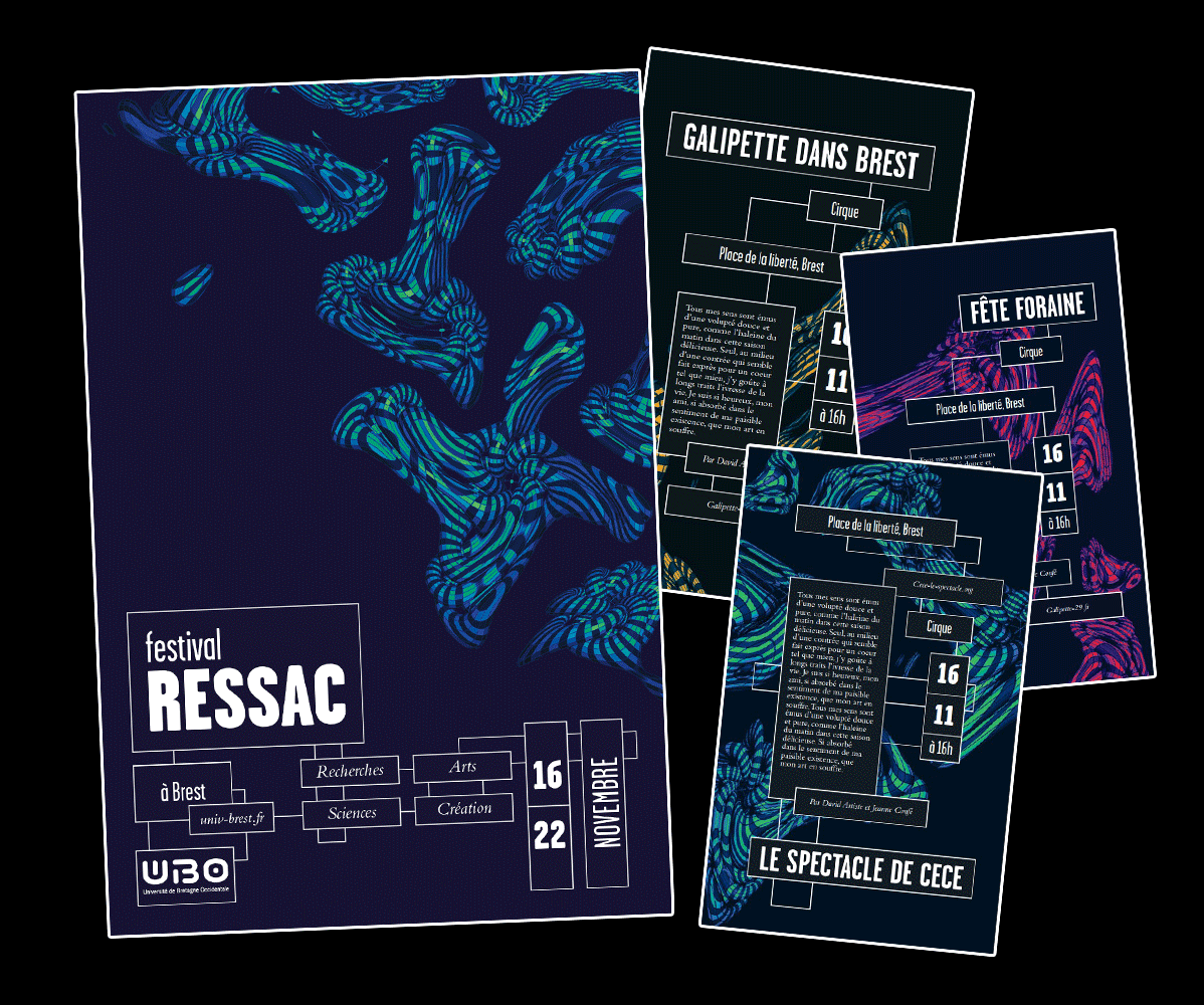Réalisation de l’identité visuelle du festival Ressac de Brest mélant arts et sciences en collaboration avec l’UBO. Créations de formes mathématiques complexes à partir d’un logiciel de visualisation de courbes puis expérimentations sur le datamoshing afin de créer volontairement des erreurs décompression altérant l’image à partir de traitement sonore.