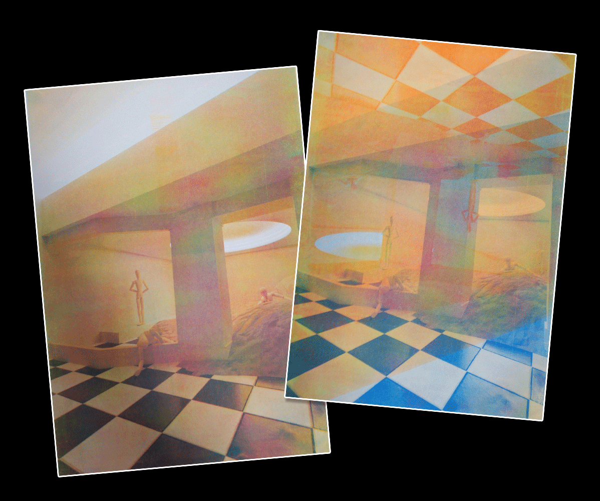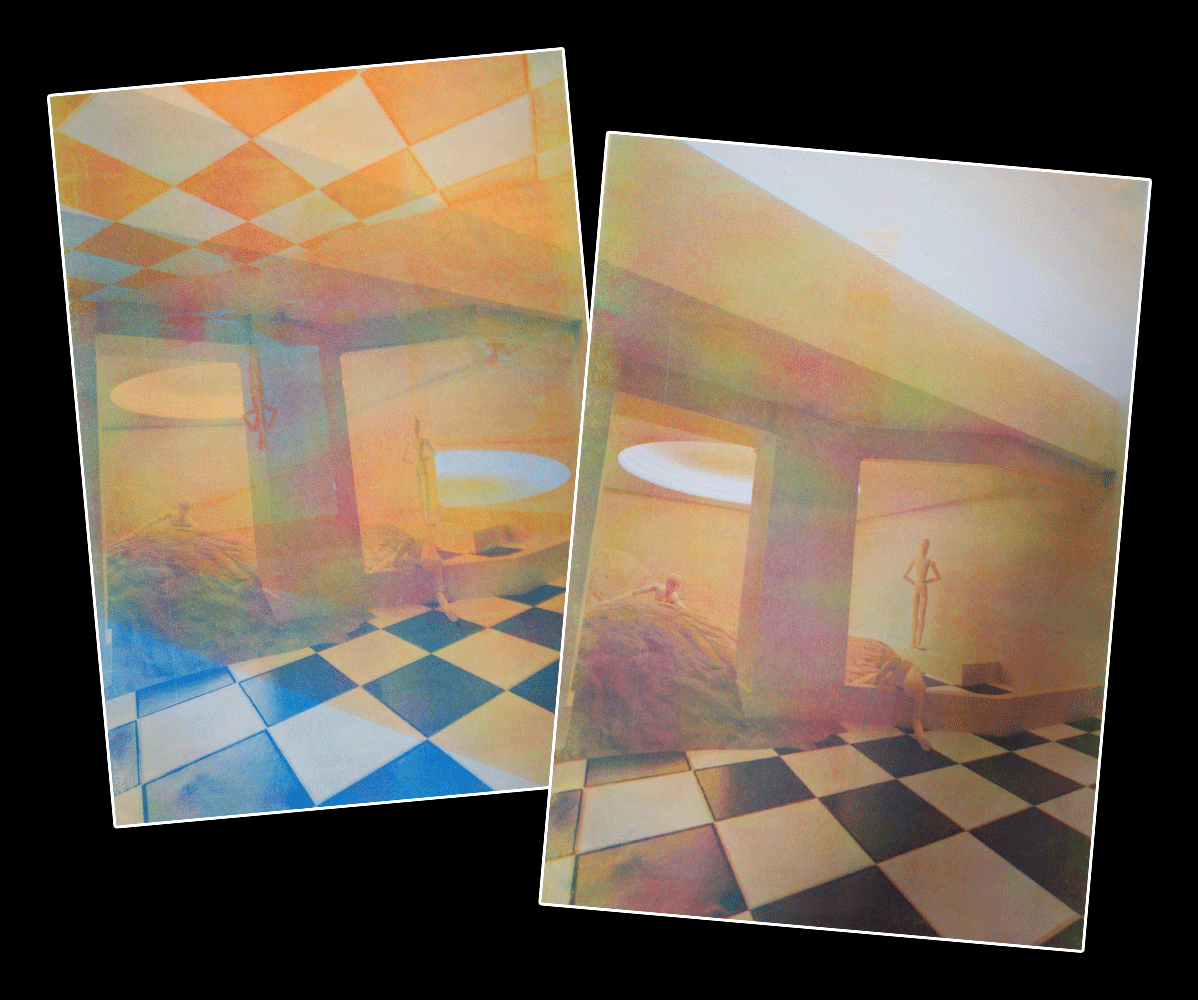 Tirage en risographie d'un visuel en 3D sur les espaces liminaux.