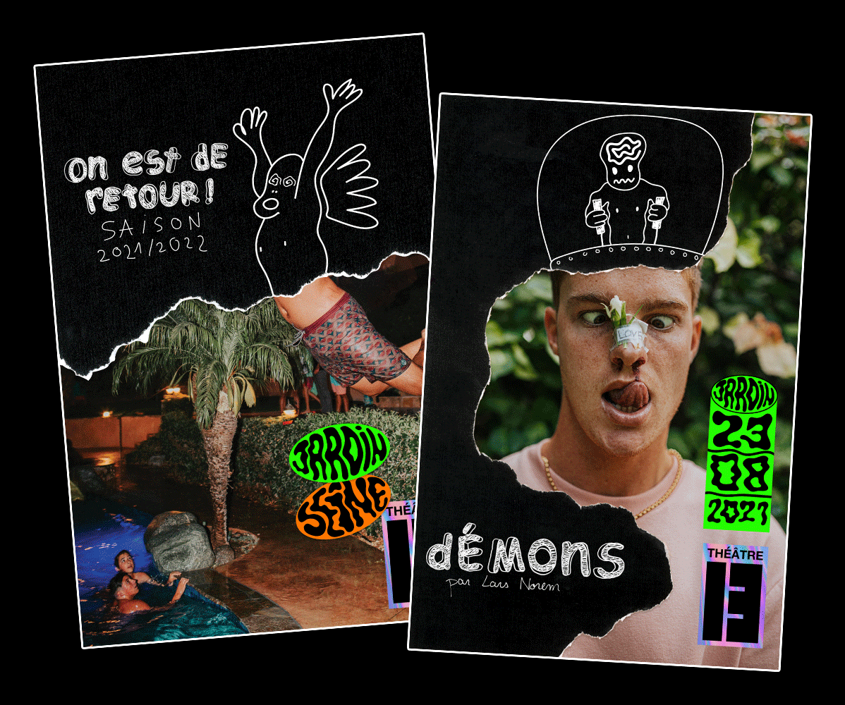 Deux workshops de Cédric Gatillon Premièrement la création d’une série d’affiche pour la programmation d’un théâtre imaginaire. Les affiches sont pensées pour être affiché à la suite créant un chemin de la première à la dernière. Le deuxième est la commande fictive du théâtre 13 avec un jeu de compositions entre photos et papier découpé.