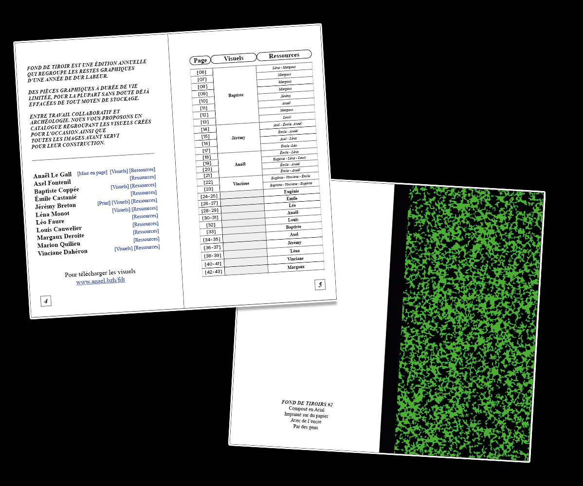Fond de tiroirs est une édition annuelle qui regroupe les restes graphiques d’une année de dur labeur. Des pièces graphiques à durée de vie limitée, pour la plupart sans doute déjà effacées de tout moyen de stockage. Entre travail collaboratif et archéologie. Nous vous proposons un catalogue regroupant les visuels créés pour l’occasion ainsi que toutes les images ayant servi pour leur construction.