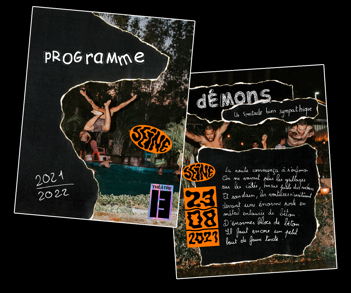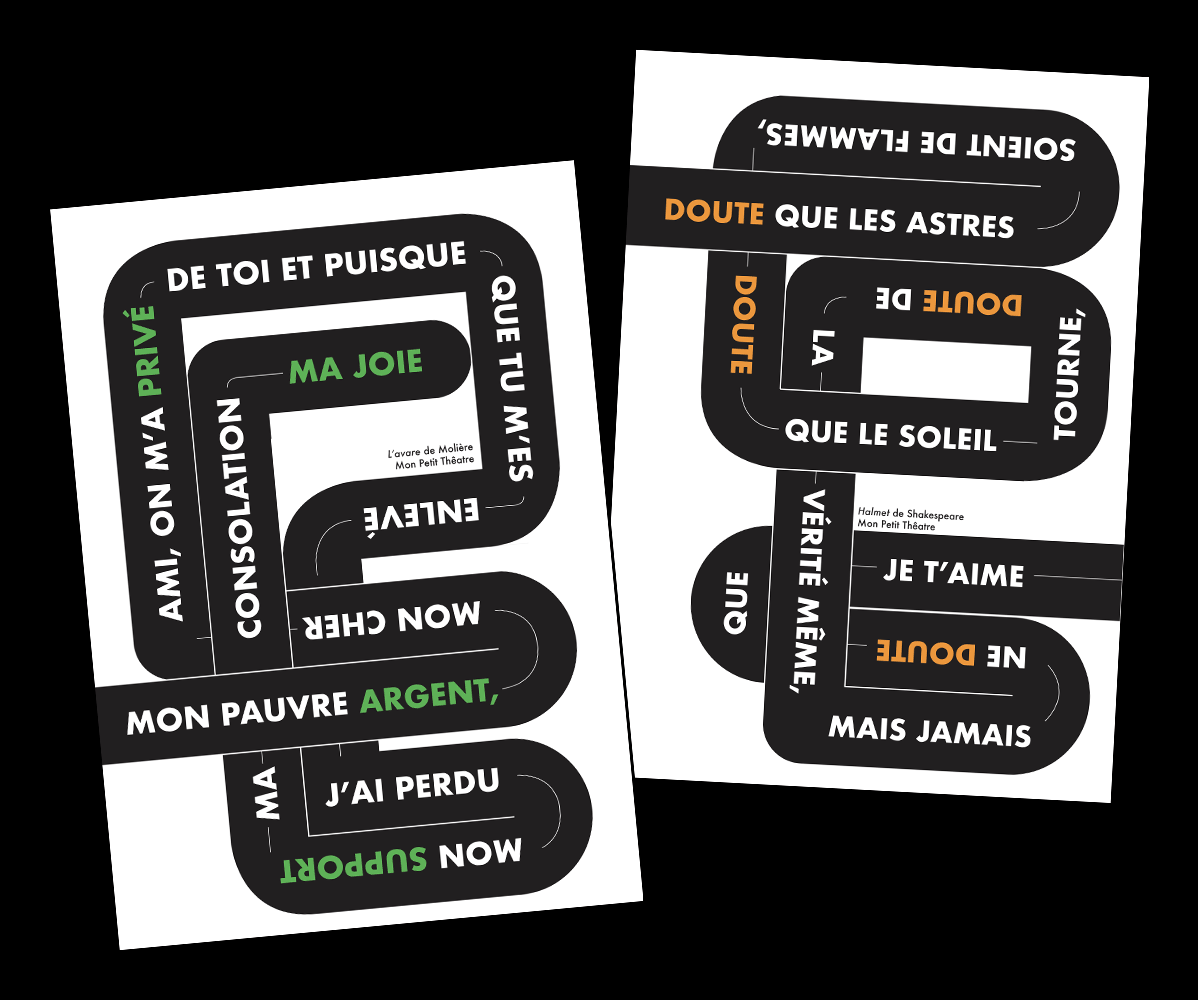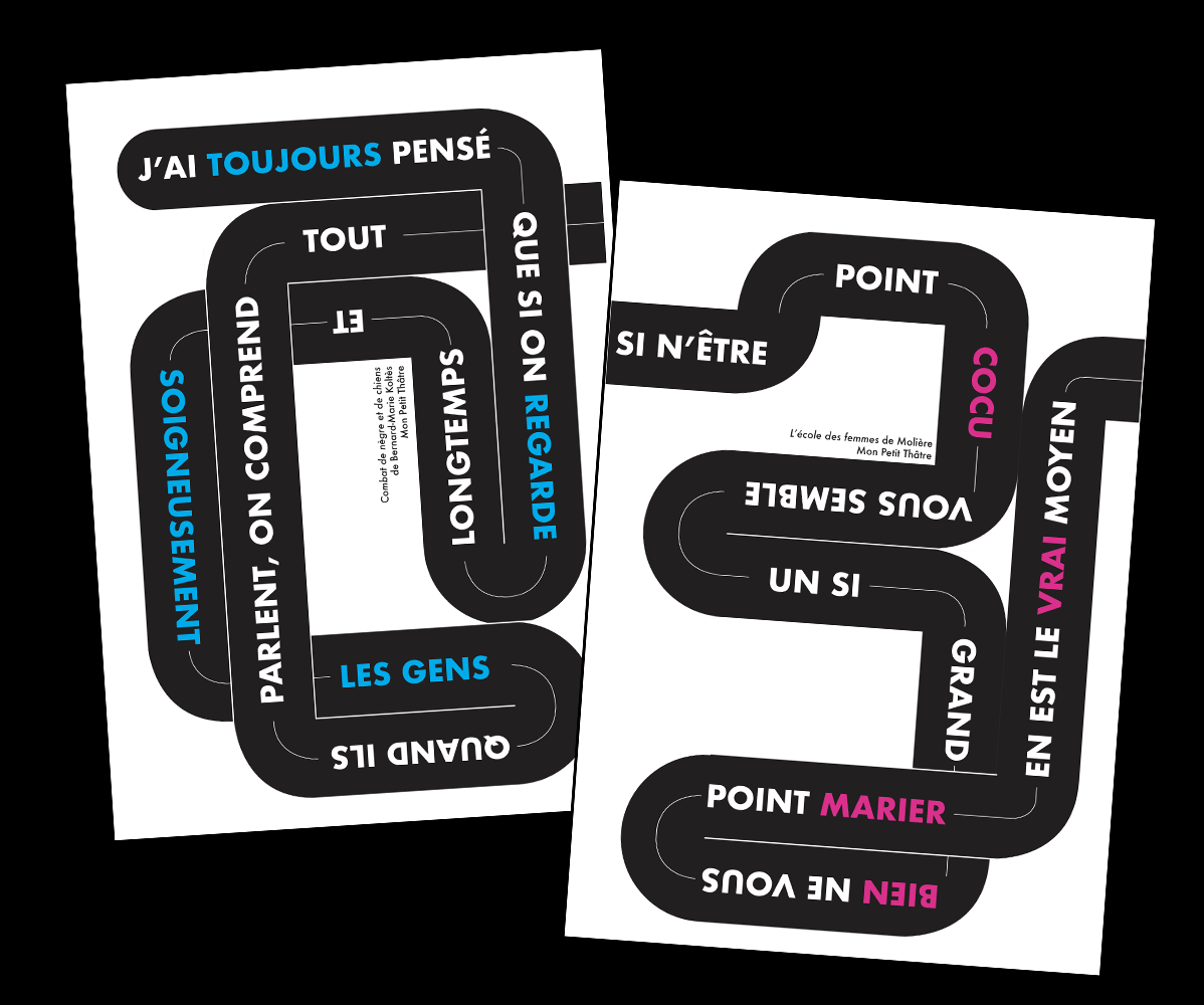 Deux workshops de Cédric Gatillon Premièrement la création d’une série d’affiche pour la programmation d’un théâtre imaginaire. Les affiches sont pensées pour être affiché à la suite créant un chemin de la première à la dernière. Le deuxième est la commande fictive du théâtre 13 avec un jeu de compositions entre photos et papier découpé.